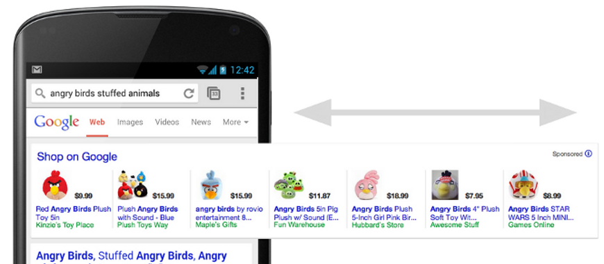 – A imagem abaixo, divulgada pelo Google Ads, destaca a atualização nos anúncios mobile, com as imagens e detalhes dos produtos sendo deslizados na horizontal.