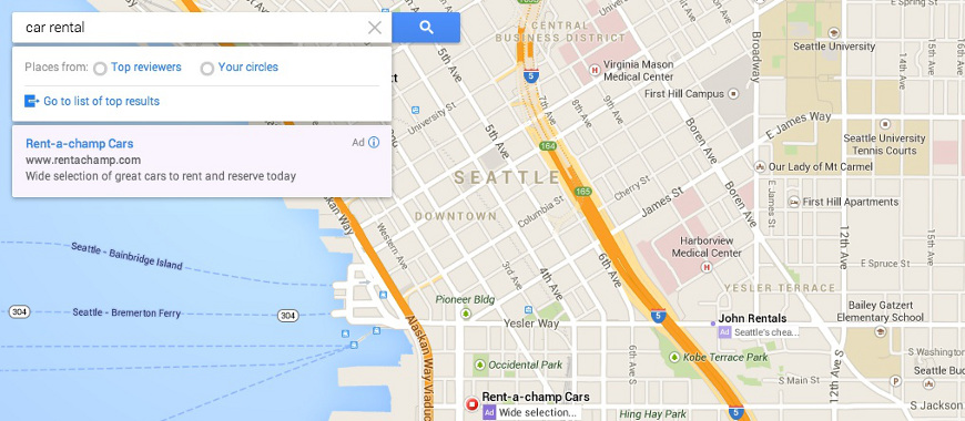 – Quando o usuário realiza uma pesquisa por um local no Google Maps, os Links Patrocinados podem aparecer logo abaixo da caixa de pesquisa e também no próprio mapa – isto no caso dos anunciantes que utilizam as extensões de local. Se seus anúncios não tiverem as extensões de localização, então, eles estarão elegíveis para serem exibidos somente abaixo da caixa de pesquisa.